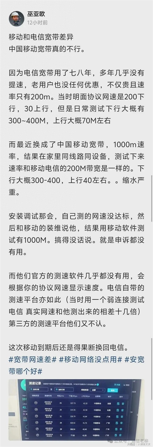 标题:网友亲身体验:移动1000M与电信200M宽带体验相近,为何考虑换回?