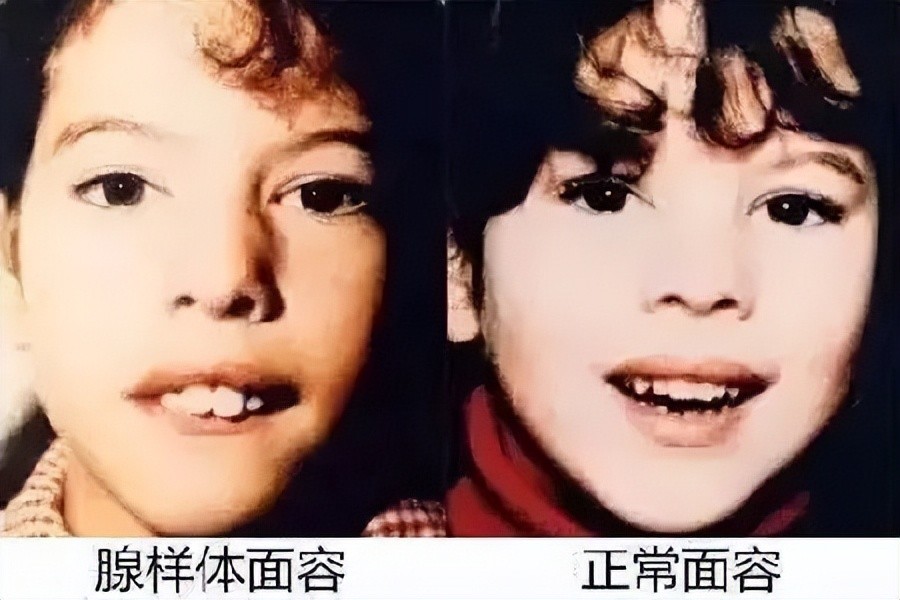 儿童因腺样体肥大堵塞后鼻孔及咽鼓管咽口,可发生耳鼻咽等症状。表现为睡眠时常张口呼吸,舌根后坠常有鼾声,夜寐不宁,鼻腔分泌物多,说话时有闭塞性鼻音,语音含糊。因为长期张口呼吸,致使面骨发育障碍,上颌骨变长,硬腭高拱,牙列不整,上颌牙外露,唇厚,面部缺乏表情,有痴呆表现,形成“腺样体面容”。