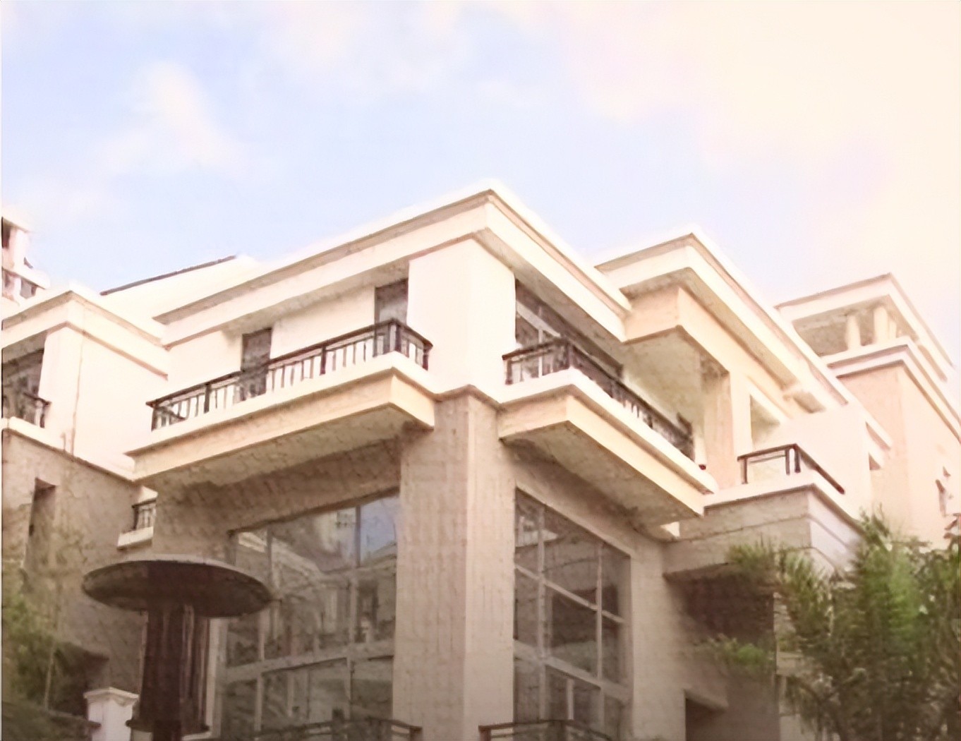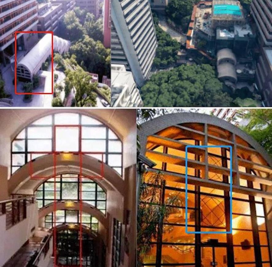 比如楼梯扶手用的柳木,一般是用来做棺材使用,又比如全楼上下只有向上的电梯,下楼却只有步梯,好像每上一层就会使人受困于棺材之内。厕所的镜子都是奇怪的全身镜,正门的三注喷泉像是三柱永不熄灭的香,就连正门的玻璃样式都是风水学中金钱剑的样式。
