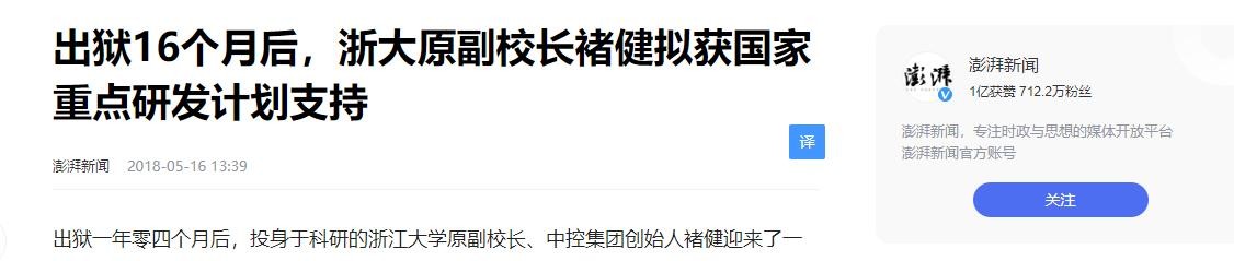 澎湃新闻——《出狱16个月后,浙大原副校长褚健拟获国家重点研发计划支持》