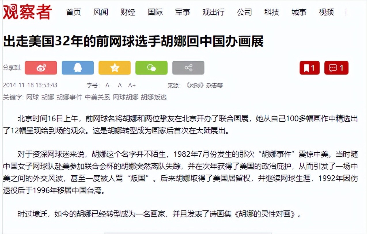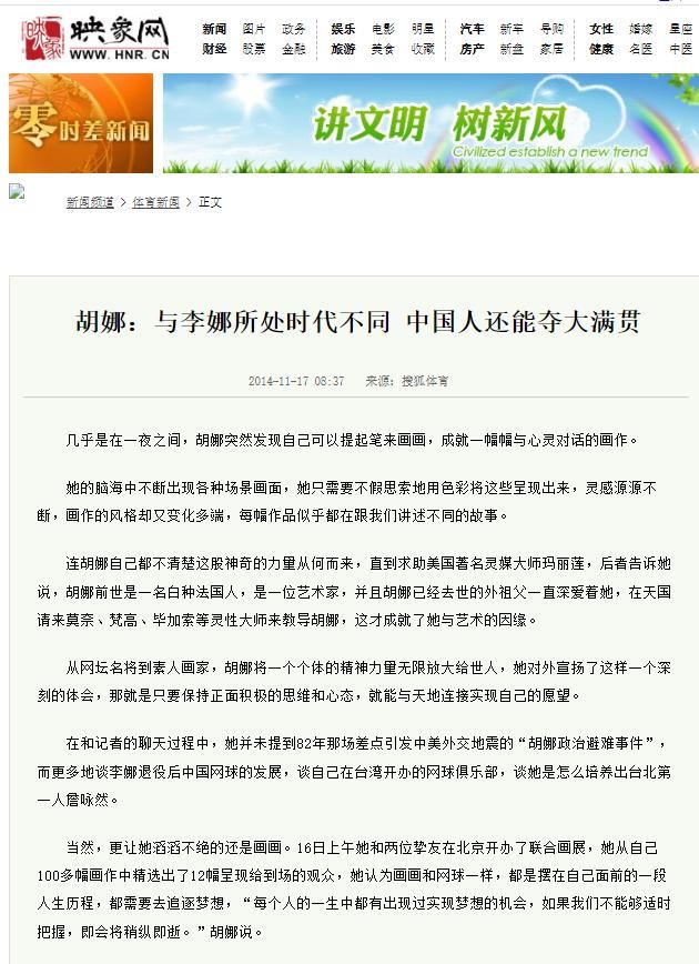 信息来源:观察者2014-11-18 出走美国32年的前网球选手胡娜回中国办画展