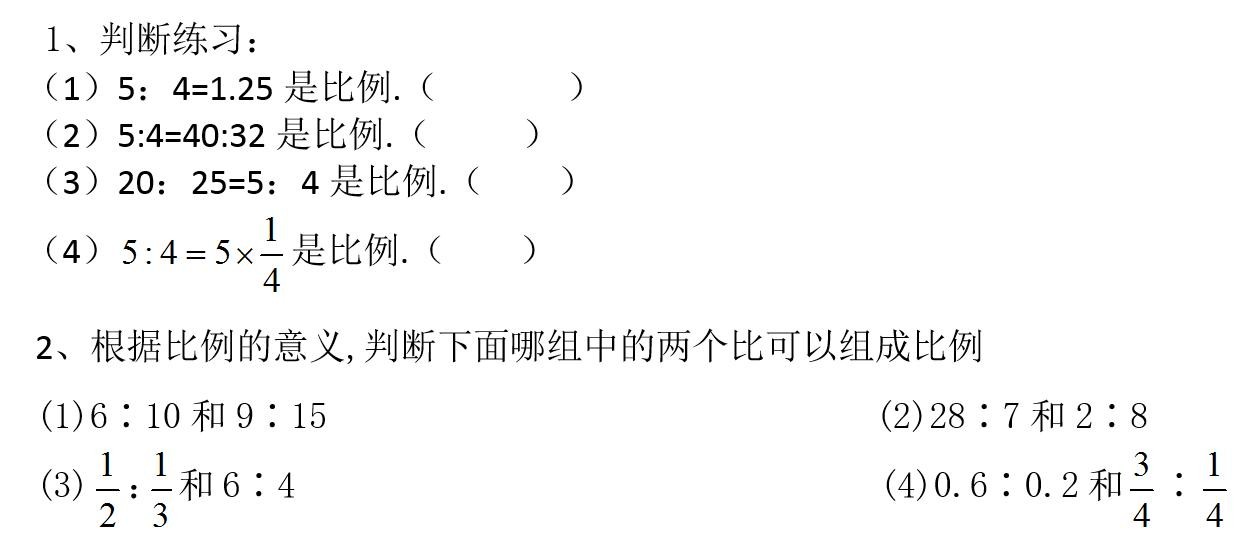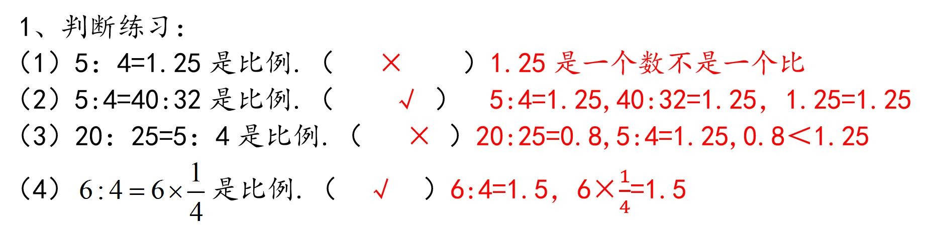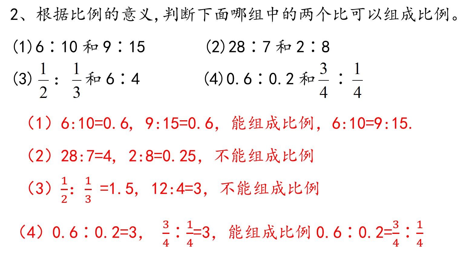 3.判断两个比能否组成比例,关键是看它们的比值是否相等。比值相等,就能组成比例;比值不相等,就不能组成比例。