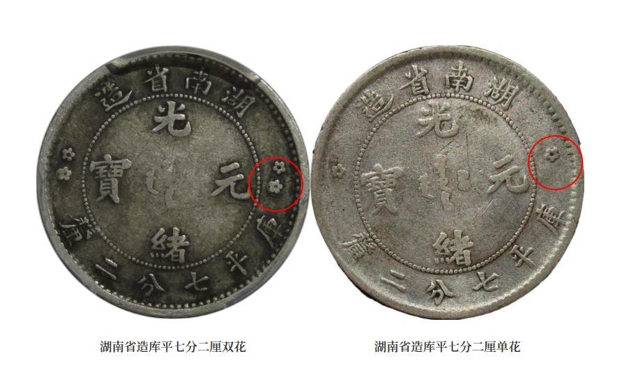 湖南省造无纪年七分二厘分为双花版和单花版(也称双星和单星版),上图红圈所示,双花版为左右两边各两个五角小花。单花版为左右两边各一个五角小花。