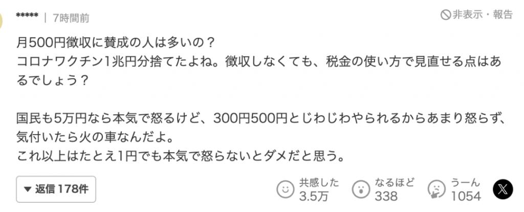由于物价高涨,日本民众本身已怨言颇多,一听还要每月再多交 500,数额虽小但怒火极大。