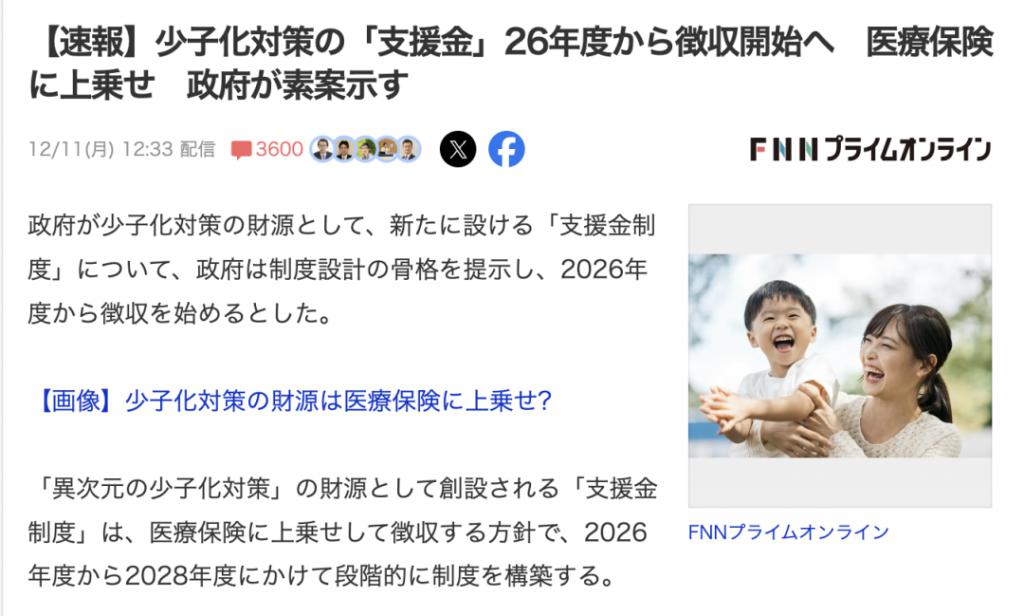 日本政府打算从 2026 年实行一项「少子化对策支援金」制度,计划从社会保险上多加收一份钱,用于支援育儿人士,目前暂定金额为「每月多薅国民 500 日元」,是否会每月越薅越多还不明确。
