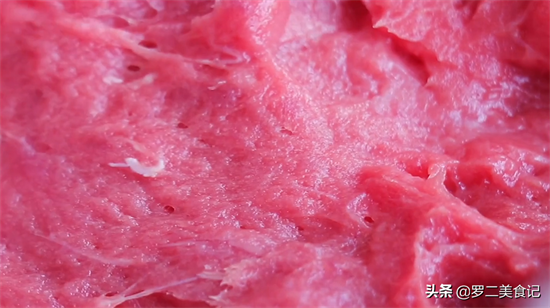 7.带上手套顺着一个方向搅拌,搅打至上劲,牛肉会非常粘稠,并且会拉丝的程度就可以了。