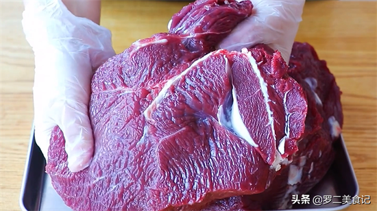 1.准备5斤的牛肉,最好用前腿肉,肉质鲜嫩,口感嫩滑。后面去掉筋膜后就剩4斤左右了。