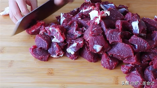 2.用刀把牛肉切成小块,带筋膜的牛肉切小块一点,后面要分开。