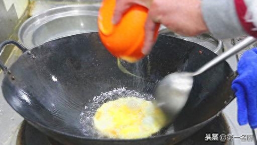烧至五成热时,倒入打好的鸡蛋,翻炒几下。