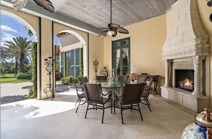 露台配有雕花壁炉,吊扇,户外餐桌,阳光满满~
