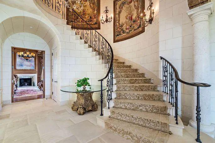 入口门厅有石砌墙、拱门和带铁艺栏杆的旋转楼梯。