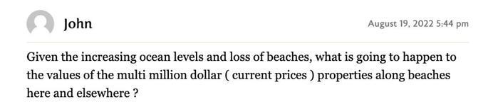 “考虑到不断上升的海平面和失去的海滩,这里和其他地方海滩上价值数百万美元(目前的价格)的房产将会发生什么?”
