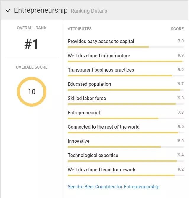 4 Entrepreneurship(权重17.42%):与世界的连接,受教育人数,创业,创新,获得资本的便利性,高水平的劳动力,技术专家,透明的商业环境。良好的基础设施建设,完善的法律体系