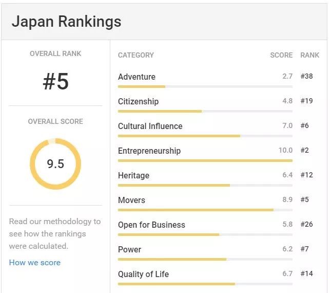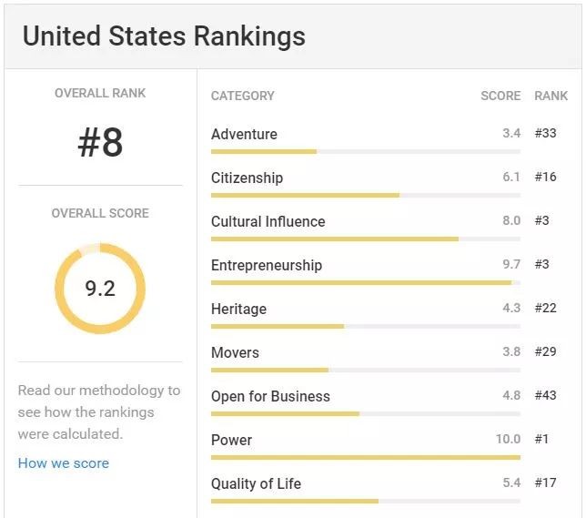 美国排在第八多少让人意外,在2016年的测评中美国还是第四位,2017年是第七位。这三年都呈现下降趋势。但是在世界影响力的排名上美国依旧高居榜首,在文化影响力和企业家精神两项测评中也都拿到了第三名的好成绩。不过,在商业开放度的测评中美国仅仅排在第43位,不知道这份榜单川普同学看了会做何感想。
