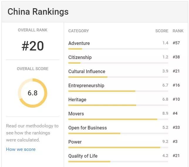 中国排在榜单第20位,跟2017年的排名一样。在世界影响力的测评上拿到了第三名的好成绩。在有活力的排名中拿到满分,位列第一。