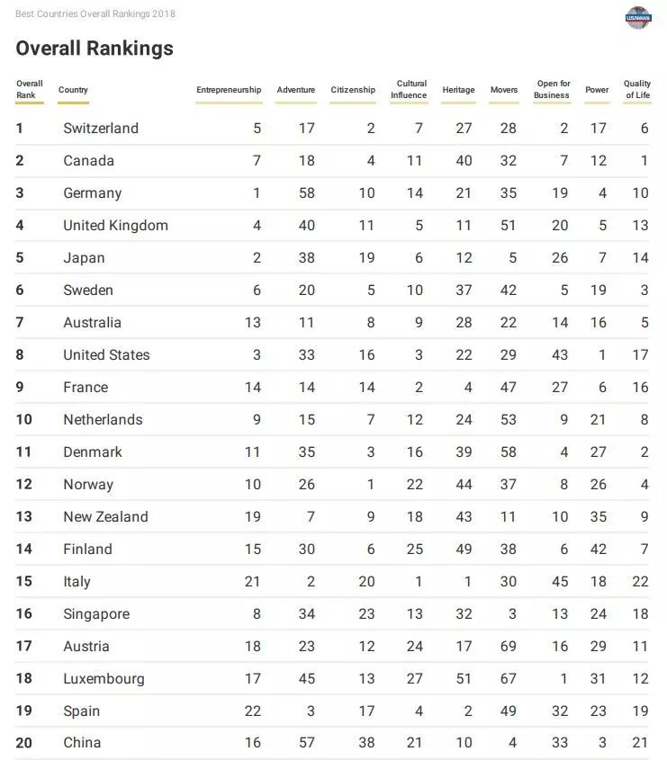 2018年全球最佳国家排名揭晓,瑞士第一中国二十 | Mr.Data