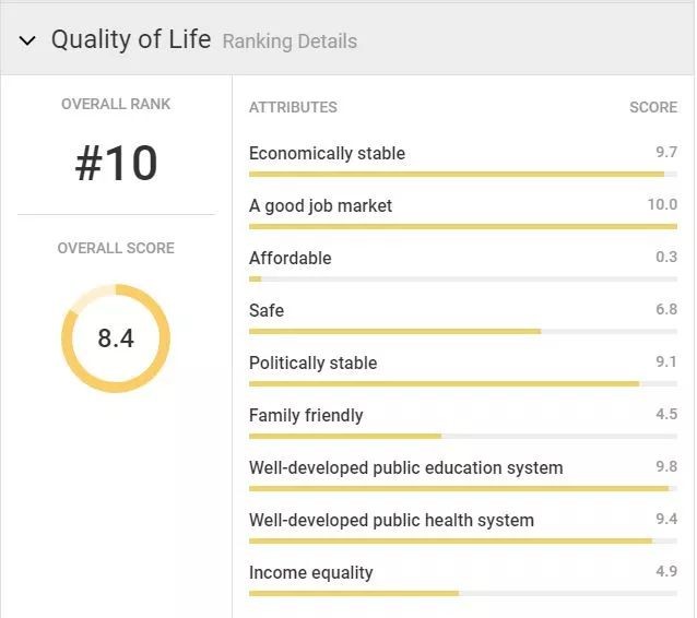 9 Quality of life(权重16.89%):劳动力市场,可承受的物价,经济稳定,家庭友好,收入平均度,政治稳定,安全,安全,发达的公共卫生教育体系