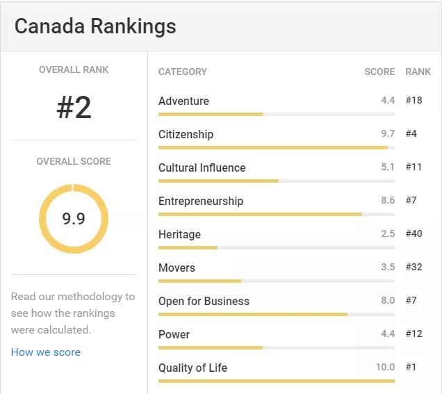 加拿大连续3年排名第二。在测评中,加拿大在生活质量方面获得第一名。