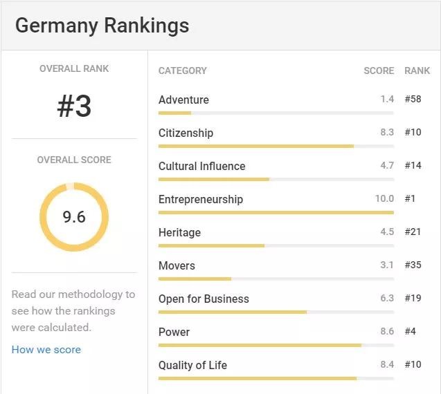 作为欧盟人口最多的国家,世界第四大经济体,德国在该榜单中排名第三。在去年的排名中,德国排名第四。德国在企业家精神这一项测评中排名第一,拿到满分10分,不愧是实体经济主导的国家。在世界影响力的测评中排名第四,名列前茅。在生活质量的测评中,德国在劳动力市场一项拿到满分,说明德国的劳动力市场非常繁荣,这跟德国近几年的经济发展密切相关,2017年德国的经济增长率达到了创纪录的2.2%,世界经济研究所甚至预测德国2018年的经济增长率还将有所上升,预计将达到2.5%。德国发达的教育系统和公共卫生体系的得分也接近满分,分别拿到了9.8分和9.4分。果然是以教育和福利闻名全世界的国家。