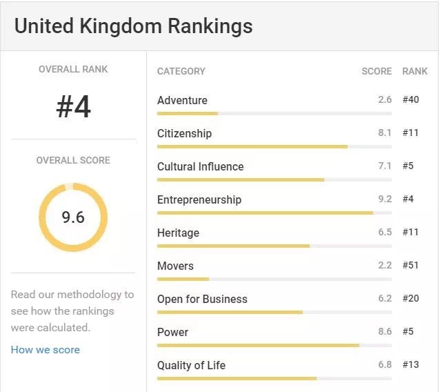 英国在去年的排名是第三,今年下降一位来到第四。9项测评中企业家精神,文化影响力以及世界影响力排名比较靠前,分别为第四,第五和第五。