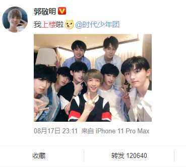 8月17日,郭敬明[微博]在微博晒出与时代少年团的合影,并发文表示:“我上楼啦”。在晒出的照片中,郭敬明坐在时代少年团成员中间,对着镜头比耶。此前,郭敬明曾在微博发文问:“‘上楼’是什么意思?最近一直看到很多人喊我让我上楼,‘如何骗GJM上楼’之类的黑话,啥意思?”