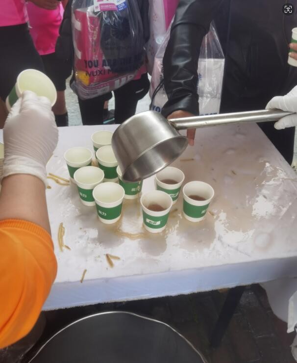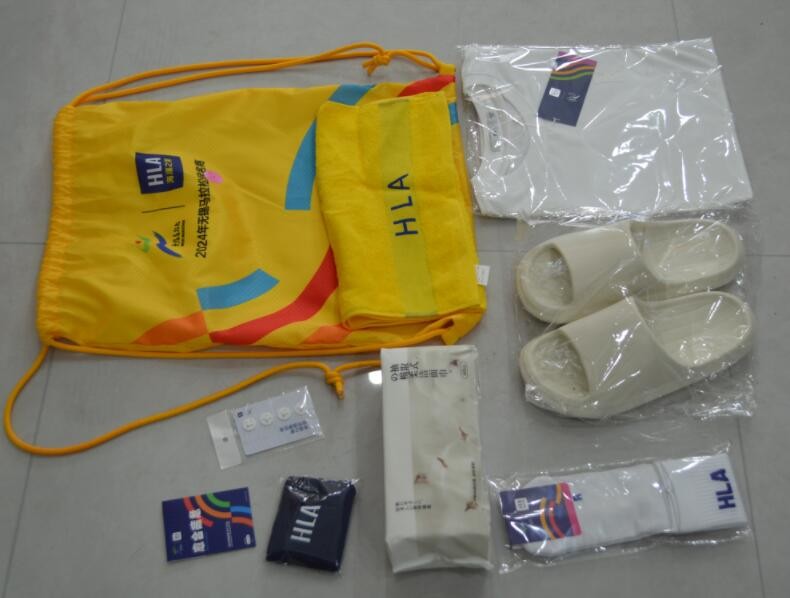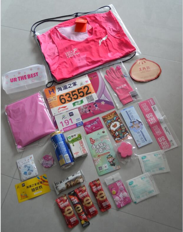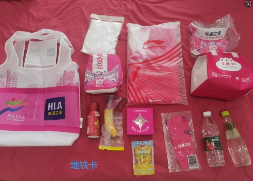 完赛包:毛巾、雨衣、鸭舌帽、味食足(零食包)、香蕉、手套(赛后右手「UR THE BEST」)、矿泉水、饮料、玉米零食、液体蛋白饮料、王兴记粉色小笼包