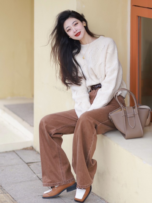 温柔软糯的针织衫搭配上慵懒随性的阔腿裤,初春季节不知道该穿什么就选这一套绝对不会出错,实穿又时髦。再搭配上一双复古时髦的乐福鞋,整体搭配简约中又透露着精致感,高级又耐看。