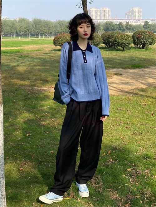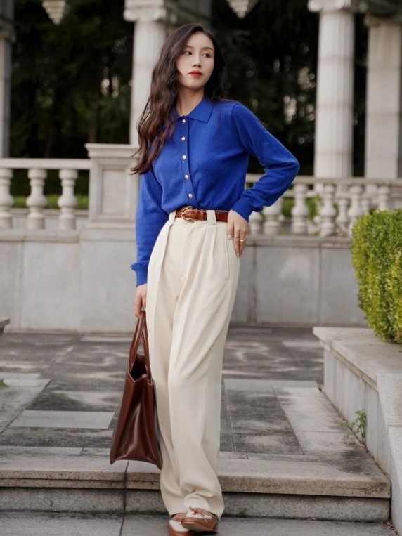 想要打造减龄感穿搭的姐妹们可以选择下图中polo领式的针织衫来搭配,精致时髦的小翻领设计赋予了整件单品更加优雅时髦的气质,美的很高级。