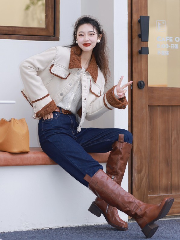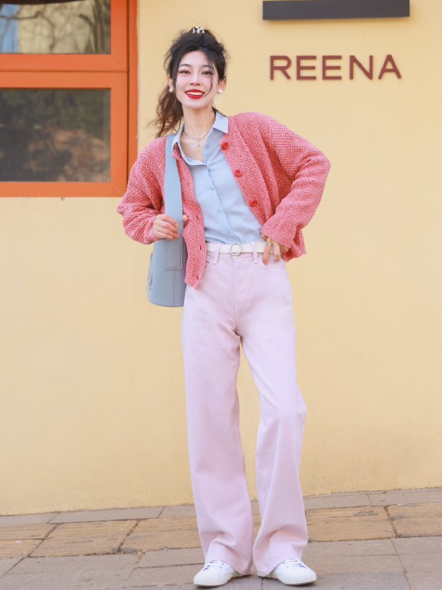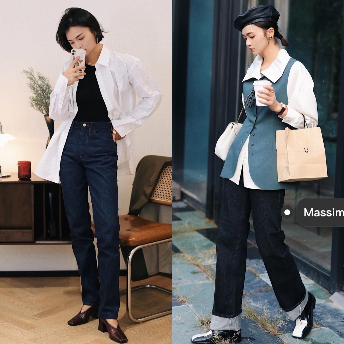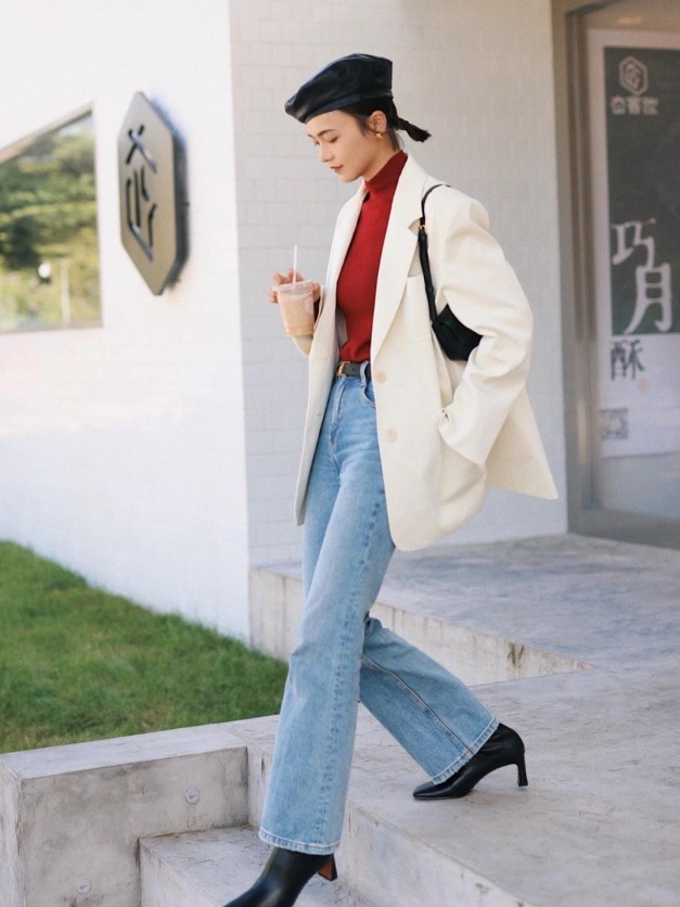 示例1:小香风外套+牛仔阔腿裤+极简风小皮鞋