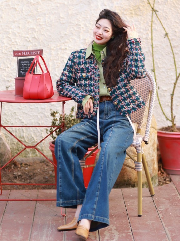复古精致的小香风外套搭配上随性慵懒的牛仔阔腿裤,轻松穿出优雅范儿和休闲感的完美平衡,完全不用担心整套look会过于显老,各个年龄段的姐妹们都能轻松驾驭。
