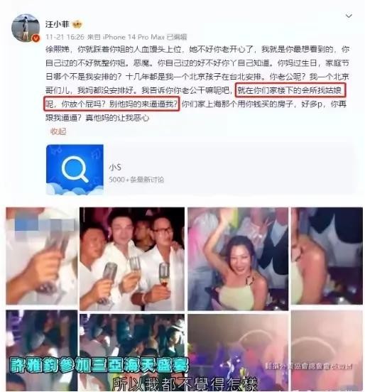 后来,汪小菲也出来爆料了。他说许雅钧在上海有别的女人,甚至小S楼下的会所里都有许雅钧的情人。