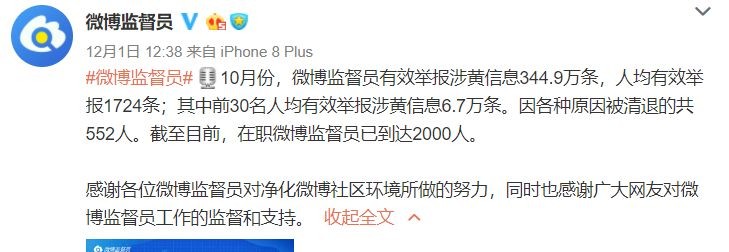 据@微博监督员 发布的最新数据,10月份,微博监督员有效举报涉黄信息344.9万条,人均有效举报1724条。