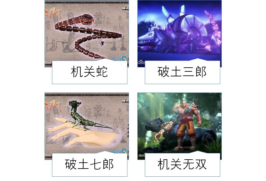 公输家的霸道机关书拿出来比较的是机关蛇、破土三郎、破土七郎和机关无双。机关蛇座位上可坐两人。战斗力很强。可在陆地上,也可在水上行走。擅长在障碍多并狭窄的地方战斗。可由一人在机关蛇头部操控整条蛇。破土七郎是小型机关蜥蜴。擅长开锁,并可发现任何机关暗道的漏洞,也可用于搜索情报,集群使用可作为攻击武器,可谓无孔不入。