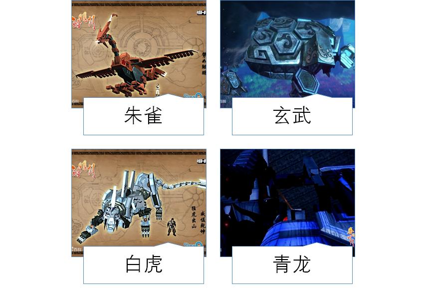 首先是进攻型的机关成品,墨家的由墨家四灵兽出战。分为机关朱雀、机关玄武、机关白虎、机关青龙。青龙是只在传说而没人真正见过。因杀气过重而被墨家隐藏。实际上墨家制造主兵战杀戮的青龙、白虎就是为了克制霸道机关术。在剧中可以明确表示,墨家主战的机关多数是由多名墨家弟子共同训练操作,其中,白虎多次出场面对公输家族的机关蛇等对手,不过零号白虎却被天明等人操作攻入蜃楼时,被破土三郎击败从而落入公输仇手里研究。