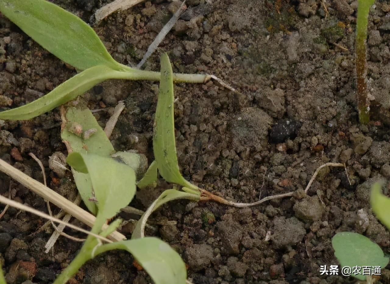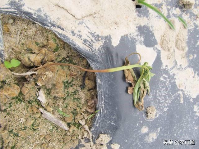 幼苗出土后,茎基部出现水渍状病斑,后缢缩、凹陷。