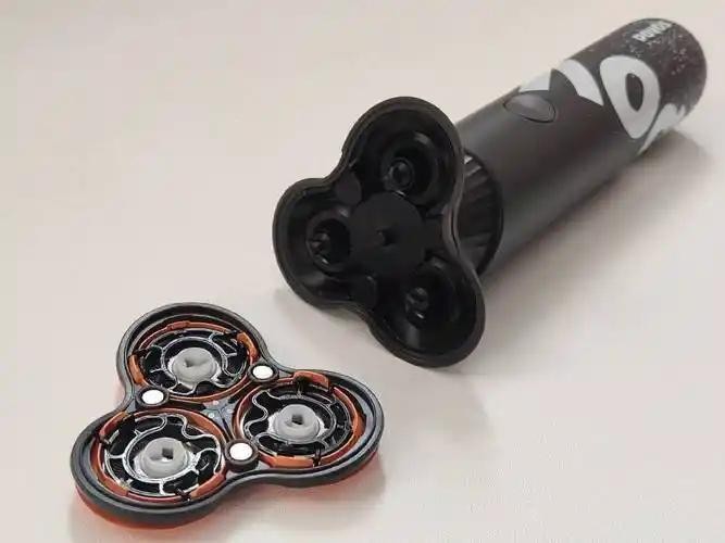 这款剃须刀的外刃架设计了一个黑色实体按钮,轻轻一推就能卸下外刀网,刀网的清理与清洗都很方便。