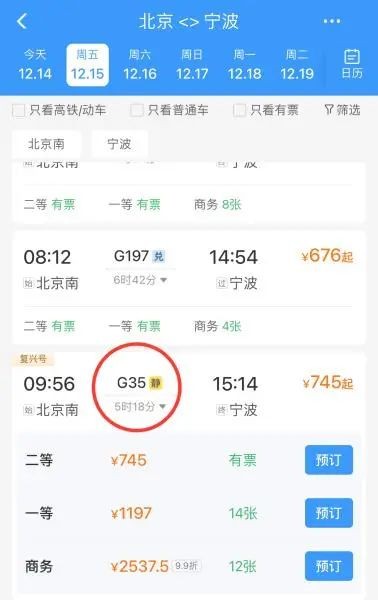 其中,G36次复兴号动车组,每天下午4点05分从宁波出发,晚上9点28分到达北京,全程5小时23分钟;G35次从北京南到宁波全程只要5小时18分钟。