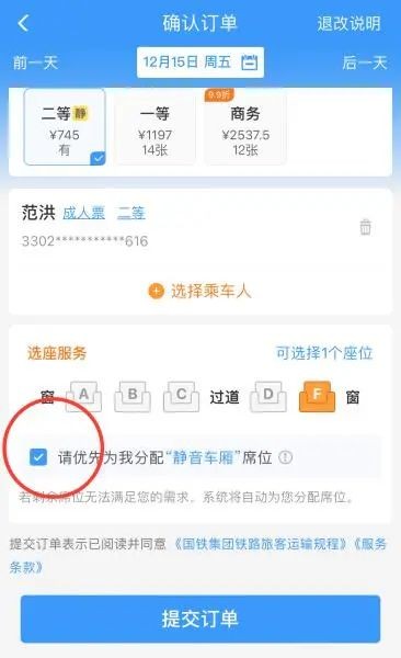 点击进入有“静音车厢”的席别,通常是二等座车厢。