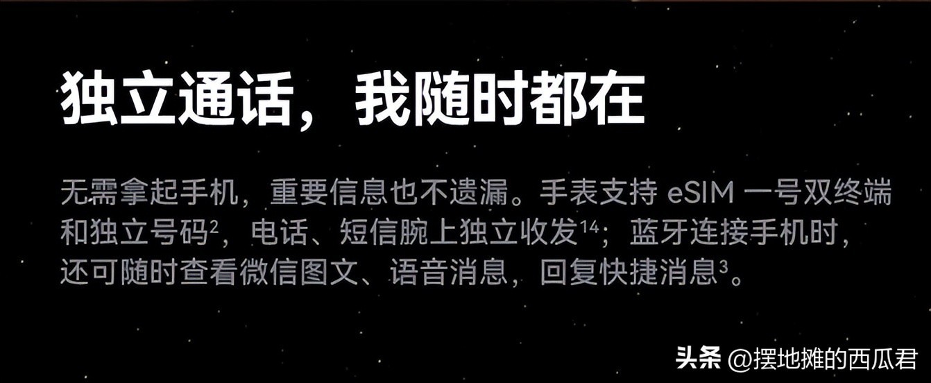 手表支持独立eSIM卡功能就可以将手机SIM卡复制在手表里面,手表可以独立的进行数据网络通信,可以独立的接听拨打电话,可以完全不依靠手机进行日常的通信、上网等需求。