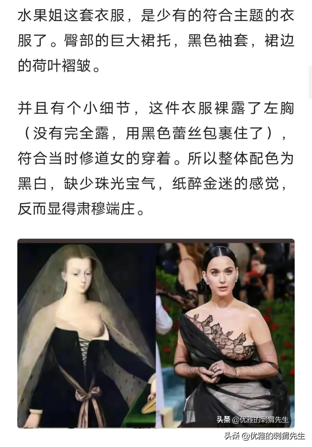 如2022年的MetGala主题为“镀金时代”,在人人都选择奢华的时候,水果姐选择了当时修女的造型。在一片金晃晃里,显得端庄肃穆。