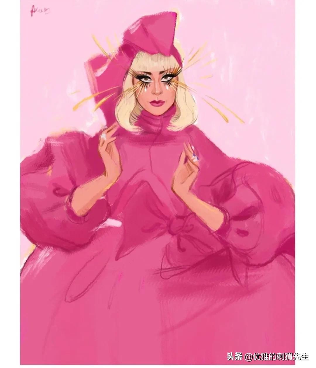 这比卡迪·碧的还像火鸡。连发色都改成了粉红。全身都是粉白的搭配。但其实粉色比较难穿,因为粉色并不是基础色,自身饱和度偏高,白色虽然内敛低调。两种有些冲突的色彩配上毛茸茸的材质,看起来很累。