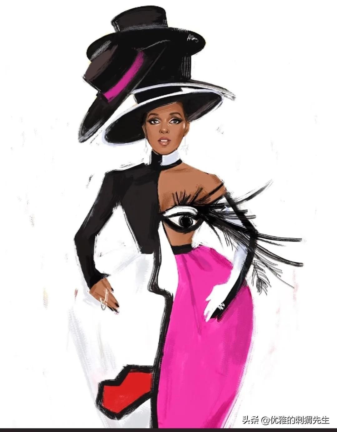 Janelle Monae:戴着多个帽子的睫毛胸衣拼色花瓶