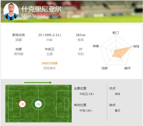 本赛季随着孔蒂入主国际米兰之后,什克里尼亚尔的定位有所调整,表现也出现了一定程度的起伏,这也是在适应期的阵痛表现。在孔蒂的三中卫的阵型下,什克里尼亚尔经常会出现在左中卫这个位置上,与以往常规的四后卫阵型不一样的是,三中卫阵型中的左中卫,职责更靠近边路,这对于惯用右脚的什克里尼亚尔来说,也是一个不小的挑战。从数据上反映而言,本赛季什克里尼亚尔共为国际米兰出场30场,平均评分为6.68,与上赛季相比还是有一定程度的下滑,但并没有那么不堪入目。可见他的调整能力还是值得肯定。