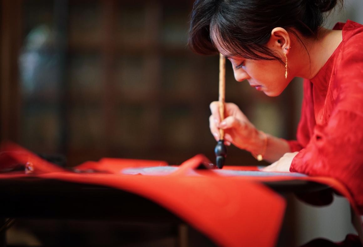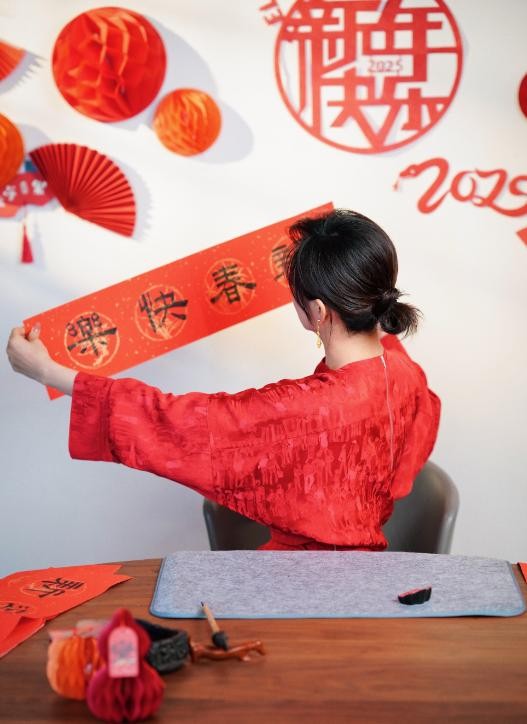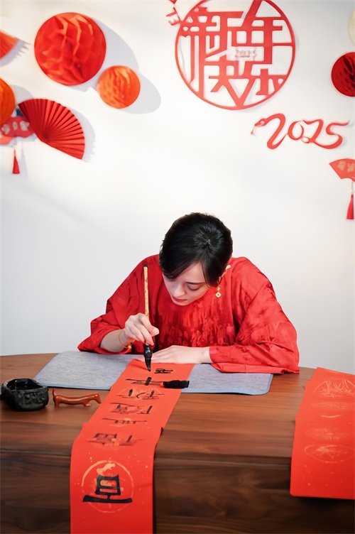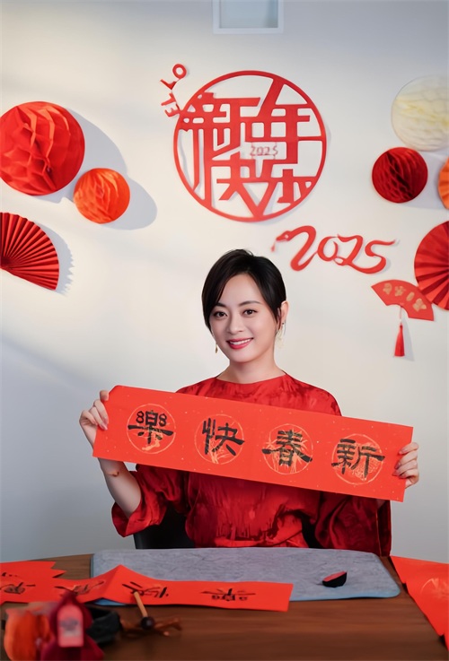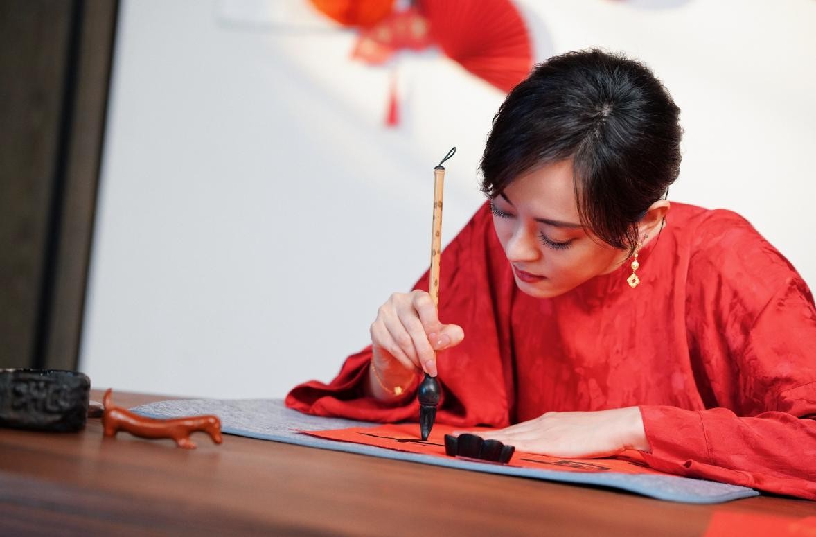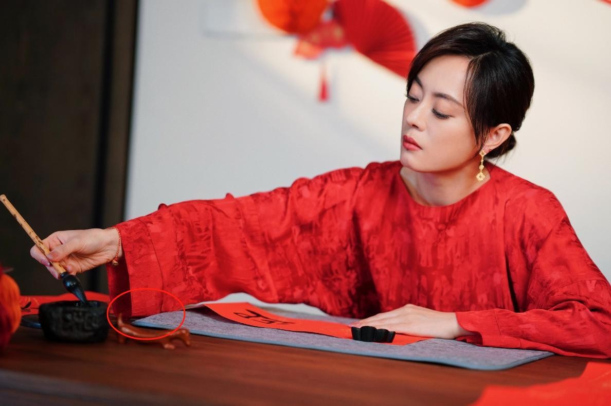 43岁孙俪自己写春联,一袭红衣人美字也好看,头顶秃了一块很抢镜