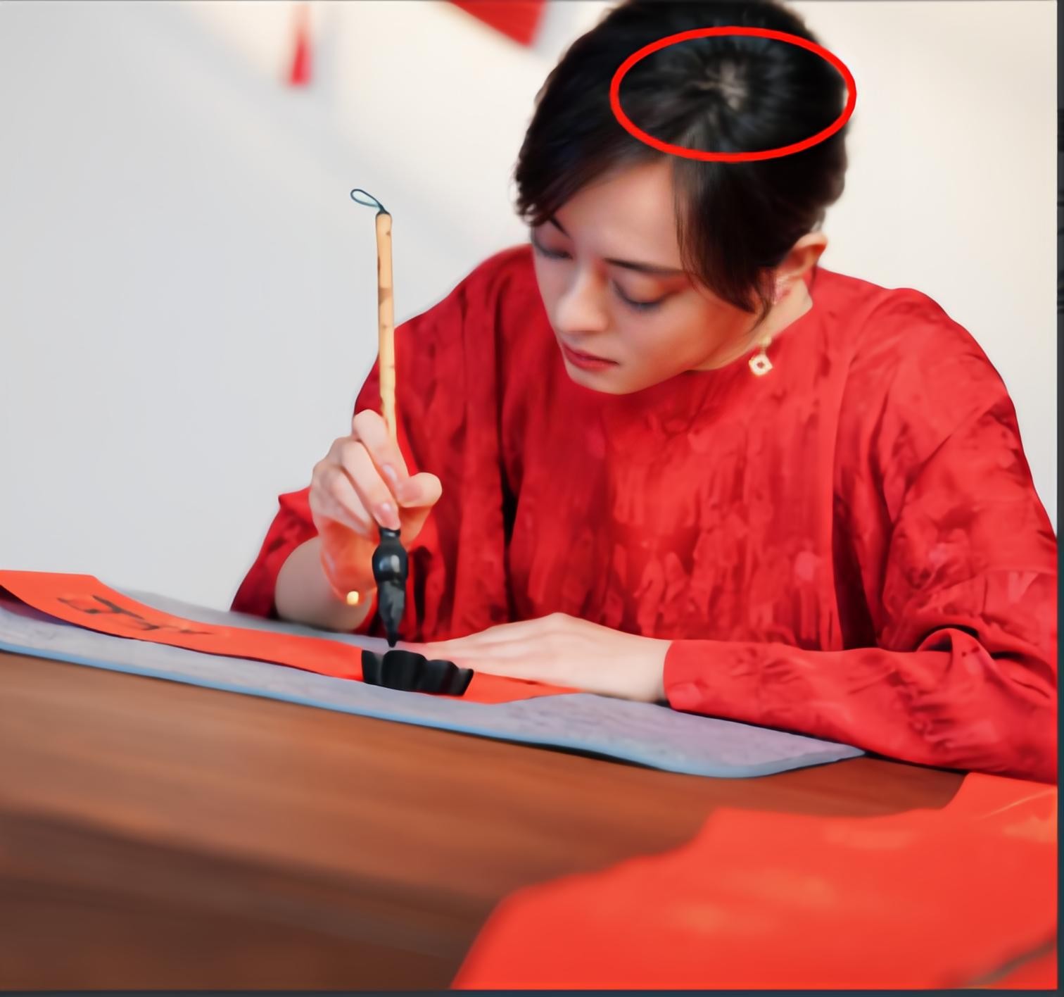 除此之外,当孙俪低头写作的时候有细心的网友发现她的头顶秃了一大块,让人猛地想起当时她在拍摄《甄嬛传》的时候曾透露。
