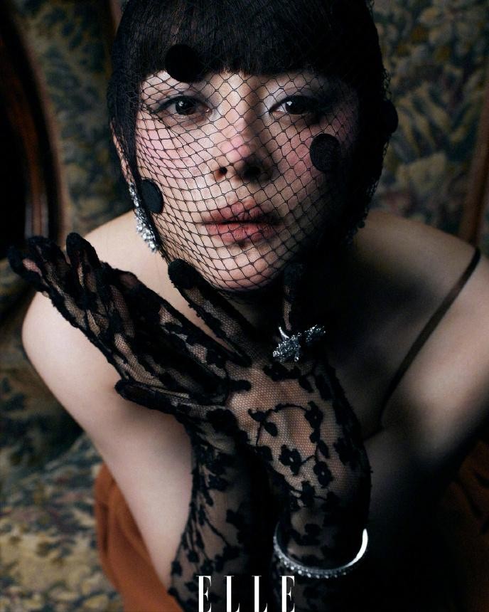 而这张照片中她带着渔网面纱、穿着吊带裙性感出镜,手上还带着长款蕾丝手套,简直不要太复古。