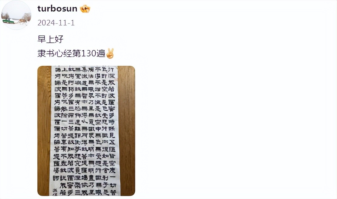 甚至还有网友质疑孙俪是摆拍,其实了解过孙俪的粉丝都知道,她从很早开始就有练习书法的习惯,前不久她还在个人社交平台晒出自己练得第130遍隶书心经。