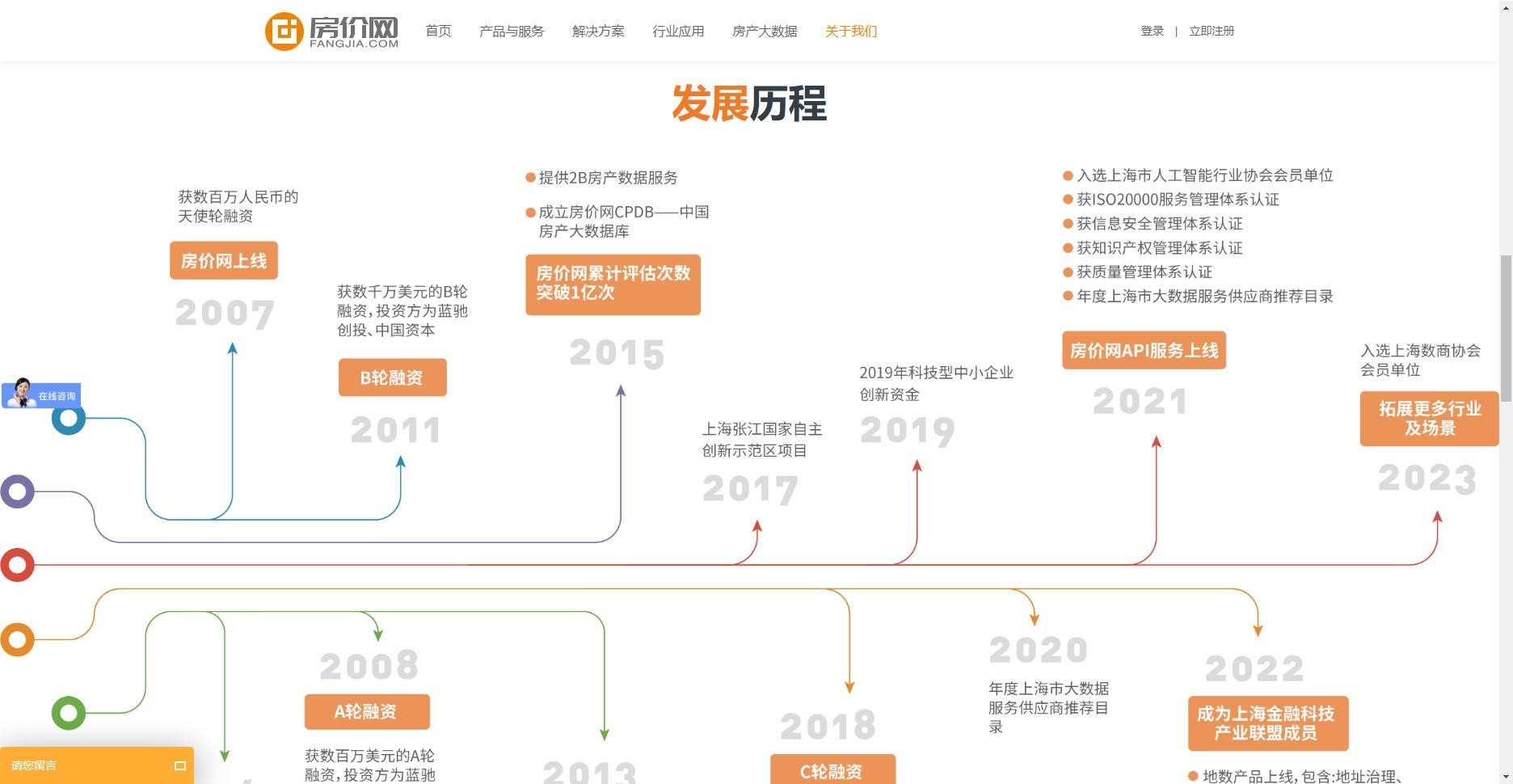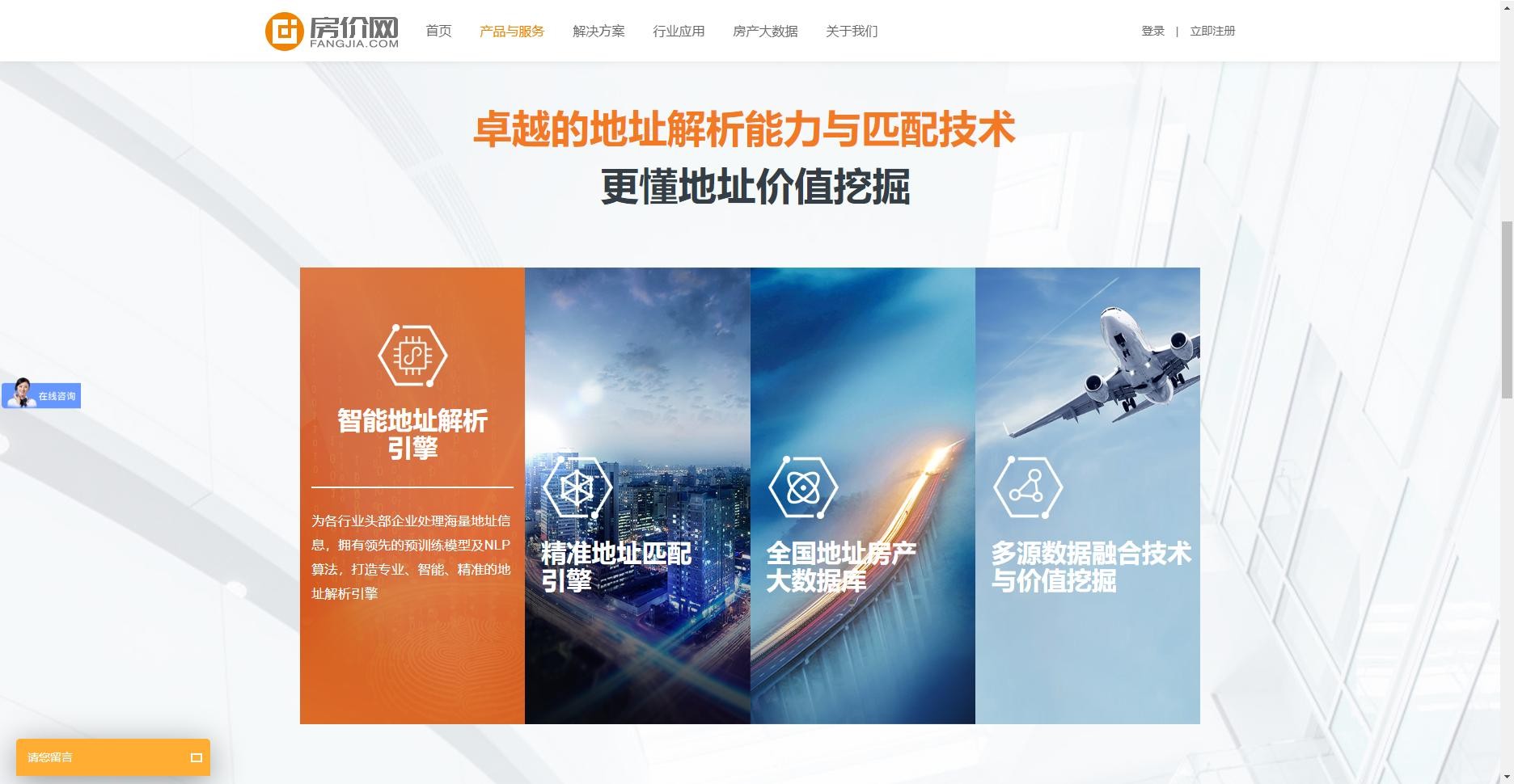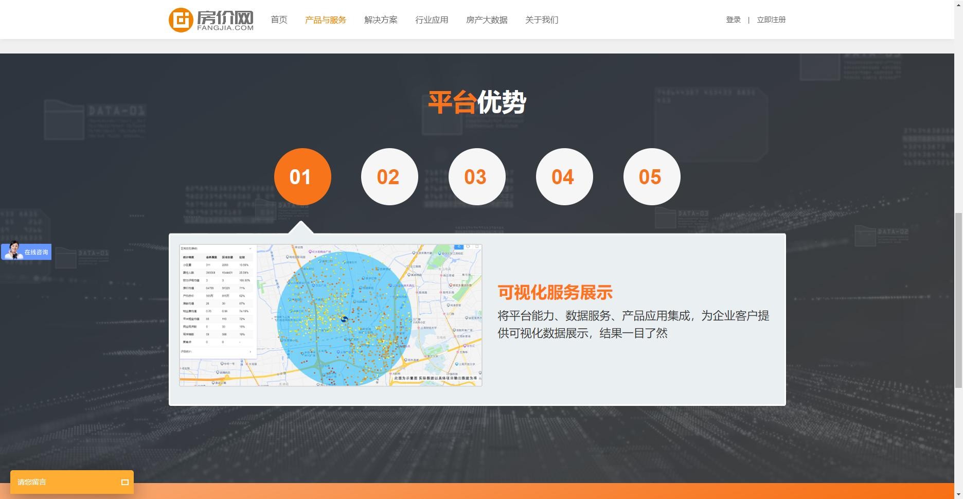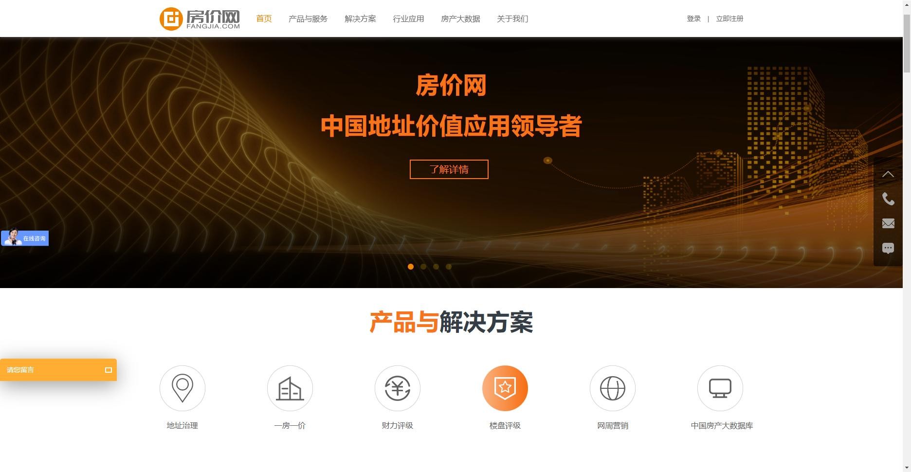 新版官网设计沿用房价网VI色调,以橙白灰为主色调;并从客户角度出发,重新梳理了网站的架构,打造了更详细、直观的目录结构,并以“首页”、“产品与服务”、“解决方案”、“行业应用”、“房产大数据”、“关于我们”六大重点栏目突出核心内容展示。