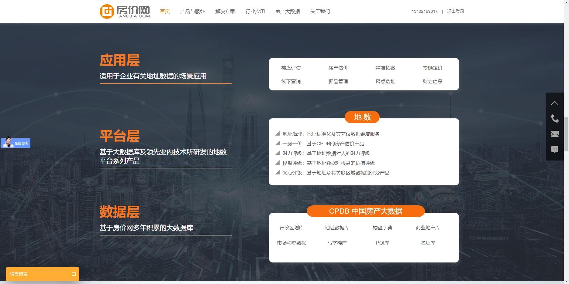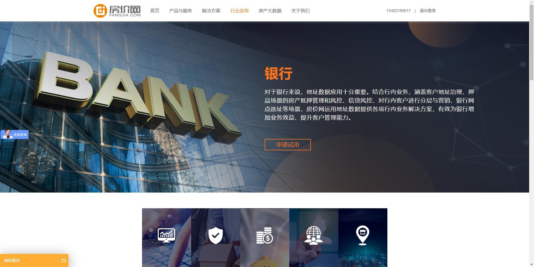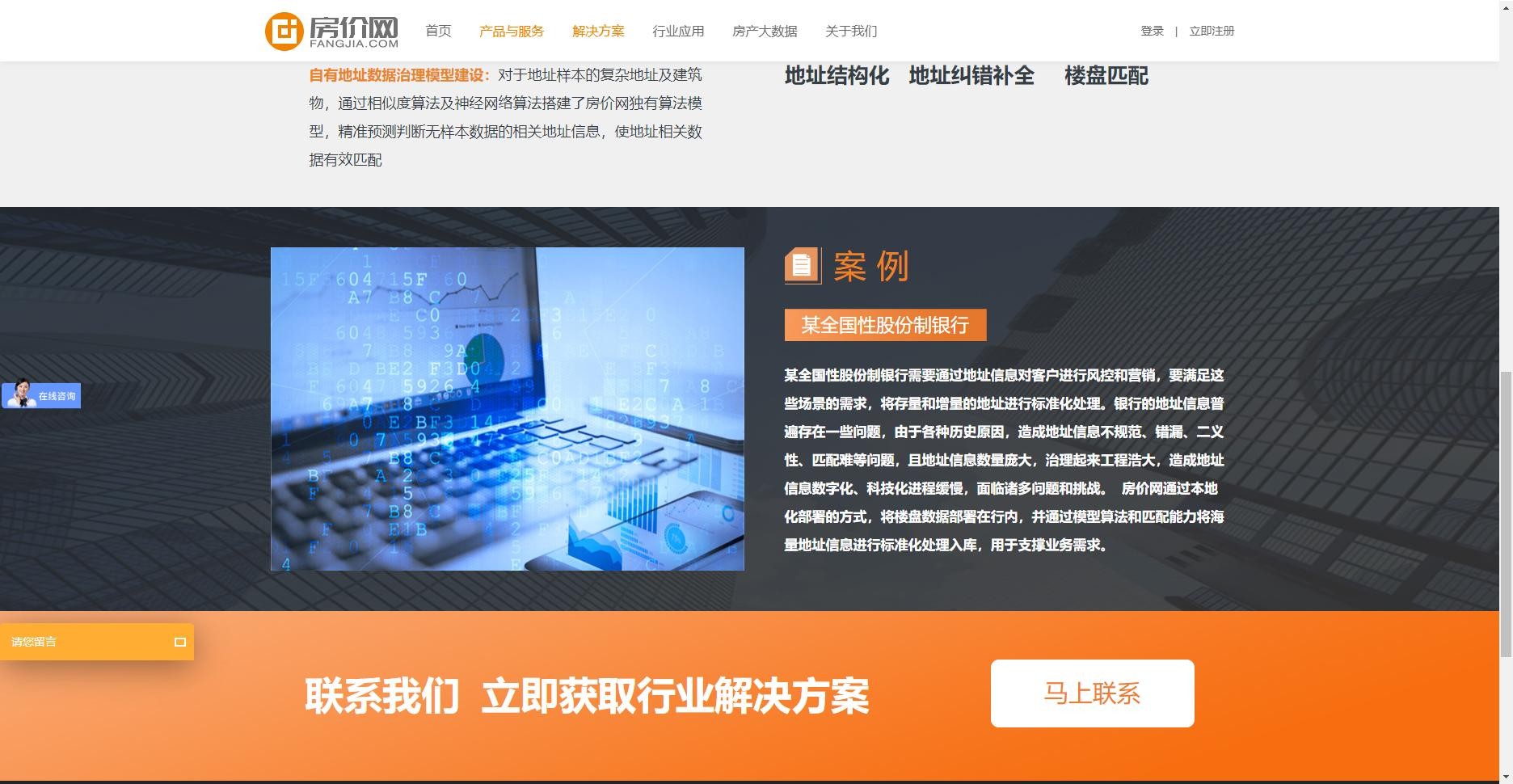 房价网不仅通过场景层面为客户展示,更从行业角度出发诠释了解决方案对不同行业解决方案。在行业应用栏目,房价网细分金融领域与非金融领域的代表行业机构,结合房价网的产品及应用方案,展示了房价网对不同行业应用起到的帮助和作用。