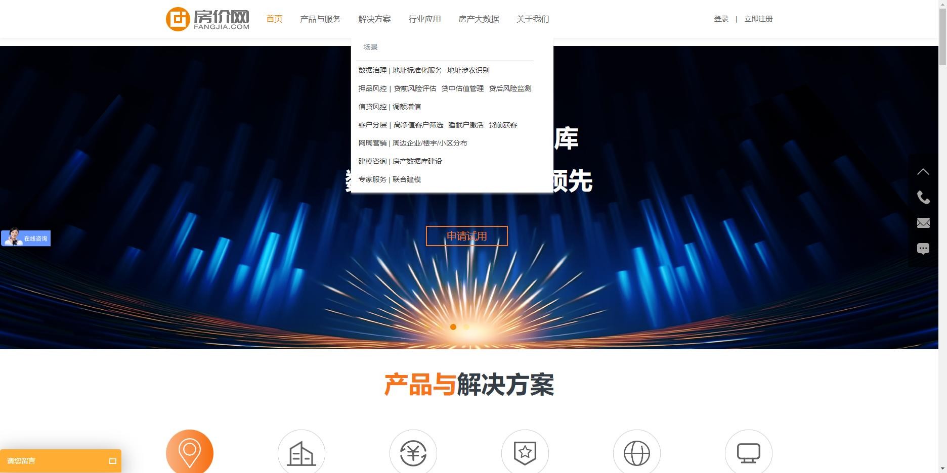 解决方案栏针对不同场景已重新梳理,在数据治理、押品风控、信贷风控、客户分层、网周营销、建模咨询及专家服务分别进行了不同维度的深度展示。每一栏解决方案都有相对应的二级页面,涵盖了解决方案的亮点、优势及案例展示。